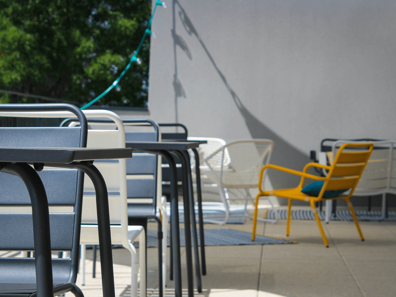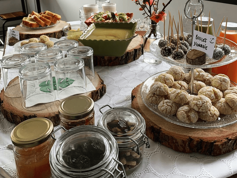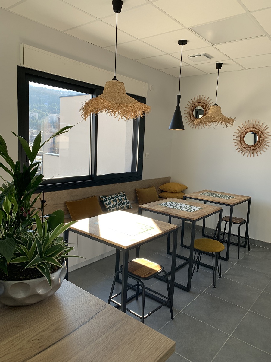 Une salle détox avec sa grande terrasse pour déguster des jus frais, thé, café, dans un décor cosy et épuré.