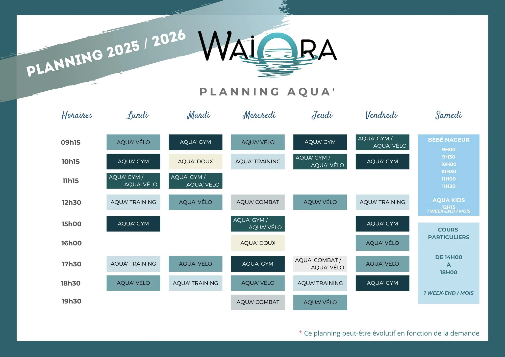 Retrouvez ici le planning des cours Sport Aqua pour l’année 2025–2026.Choisissez le créneau qui vous convient et progressez à votre rythme grâce à des séances régulières, accessibles à tous les niveaux.